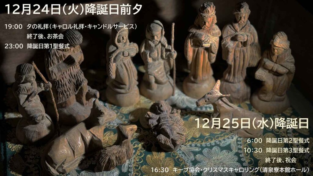 - 2024年クリスマス礼拝クリスマス・シーズンの礼拝予定をおしらせします。 12月24日(火)降誕日前夕 19:00 キャロル礼拝(降誕日前夕の礼拝)23:00 降誕日第1聖餐式 12月25日(水)降誕日 06:00 降誕日第2聖餐式10:30 […]